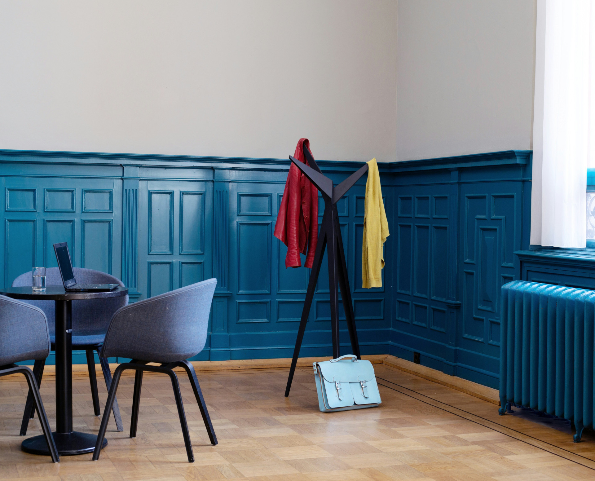 Designet består av bøyler i forskjellige høyder som gjør det mulig å henge opp kåper, vesker og tilbehør på en organisert måte. Den vertikale strukturen utnytter høyden effektivt og krever minimalt med gulvplass.